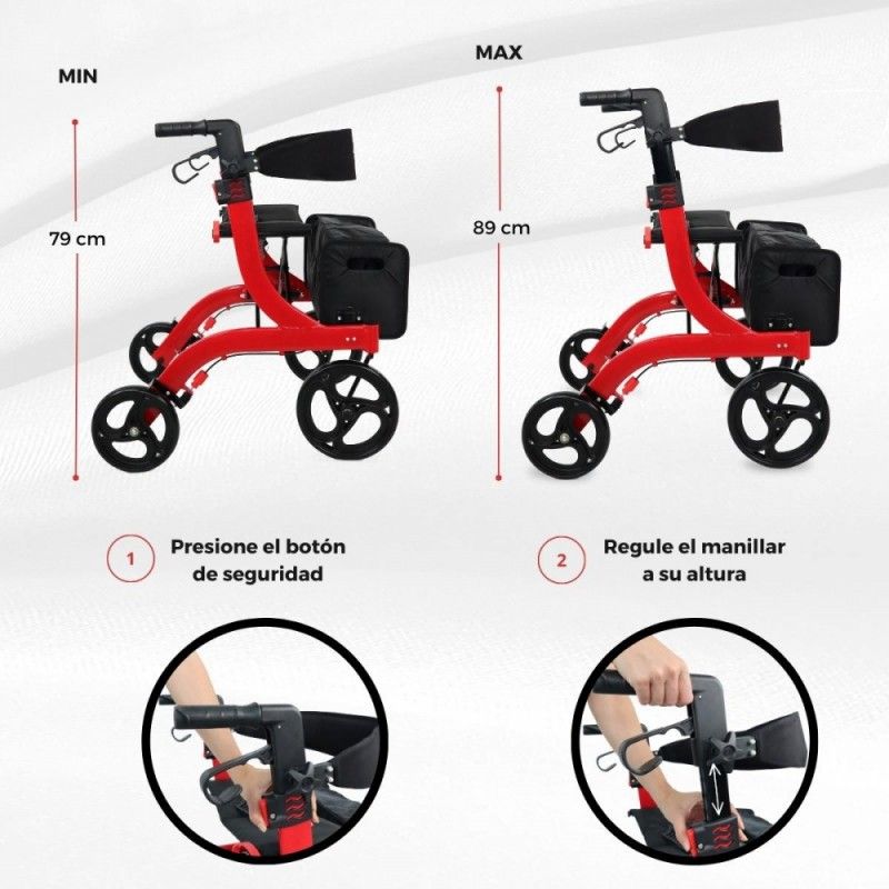 TODOTERRENO: Su estructura de acero y sus ruedas robustas proporcionan una gran resistencia al andador, pudiendo soportar hasta 100 kg. Además, se trata de un modelo ergonómico que puedes usar en diferentes tipos de suelosSEGURO: Este andador para adultos dispone de dos tipos de frenos que se accionan fácilmente al ejercer presión sobre las empuñaduras o manetas, tanto de bloqueo como de freno en movimiento para garantizar una gran seguridad en el usuario y prevenir posibles caídasCON ALTURA REGULABLE: Ofrece la posibilidad de regular la altura desde el manillar de acuerdo con las medidas del paciente, lo que facilita notablemente la comodidad del mismo y evita la aparición de otras dolencias muscularesPLEGABLE: Ocupa poco espacio y se puede guardar fácilmente en prácticamente cualquier maletero gracias a su sistema de plegado, por lo que facilita mucho su transportePUERTAS Y MALETERO: Este andador de cuatro ruedas tiene una anchura total de 58.5 cm, por lo que puede pasar sin problema por puertas de ancho estándar de 62.5 cm. Asegúrese de las medidas de sus puertas y vehículo para comprobar que le viene bien