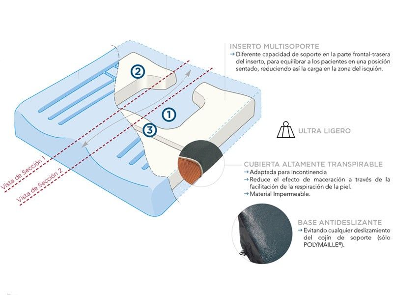 -Distribuye la presión a la zona periférica de los glúteos, estabilizando la inmersión de la pelvis y evitando que llegue a la zona de fondo.