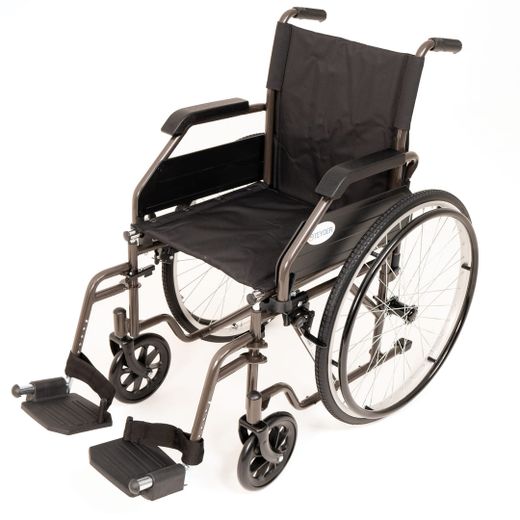 Silla básica con tapizado de nylon transpirable y lavable. Estructura plegable. Reposabrazos abatibles. Reposapiés extraíbles y abatibles hacia el exterior. Regulables en altura. Ruedas traseras macizas con sistema de extracción rápida (quick release).