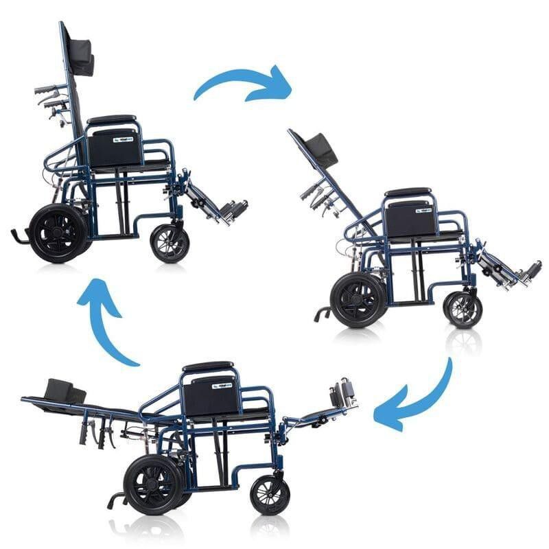 La silla de ruedas de acero se caracteriza por su respaldo reclinable de 180º, los reposapiés elevables y el cabezal.El chasis es de acero inoxidable lo que evita el deterioro. Además, el tapizado acolchado de color negro es transpirable e ignífugo. Existe la opción de poner los reposapiés individuales normales en vez de los reposapiés elevables.Los reposabrazos son rectos y tienen un clip de seguridad que los bloquean para que no se muevan, son fácilmente desmontables.
